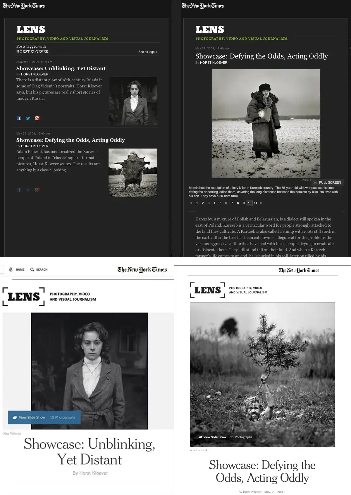 I have written several articles for the New York Times magazine LENS and published them since 2009. Two examples you can find online, follow this link to the article about Russian photo artist Oleg Videnin with twenty reader comments. The article about Adam Panczuk’s photography from Poland you can find here: lens.blogs.nytimes.com/2009/05/29/showcase-defying-the-odds-acting-oddly