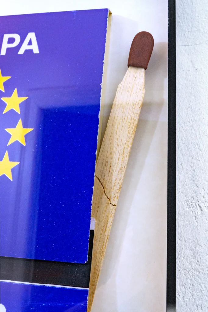 So, what inspired me to create Match Pop Art? It’s another personal discovery, this time flipping through an outstanding design book: POP ART DESIGN, published by the Vitra Design Museum. I became aware of the fascination with everyday objects not only of American pop artists, but also of their European counterparts, the Nouveau Réalistes (New Realists). I must admit that I never paid the same attention to all of them. One of them is Christo, who became hugely popular alongside Jeanne-Claude. As well as hiding and wrapping things, buildings and entire landscapes like this couple did, one could also destroy and burn. Taking a more Zero-like approach (Zero was a 1960s art movement emphasizing light, motion, and space), Bernard Aubertin (1934-2015) used to burn thousands of matches in his fire paintings and drawings. Aubertin, began creating “Tableaux de feu” in 1961. These monochrome red panels were studded with rows of matches, which Aubertin often ignited during gallery exhibitions, leaving behind charred grids and, at times, incorporating burned matchbooks into the work (Boîtes d’allumettes brûlées, 1974). His practice fused painting, performance, and sculpture, foregrounding real combustion as both material and metaphor. In homage to his passion for burning, I added a third incinerated match to the two in my design piece Superamerica.