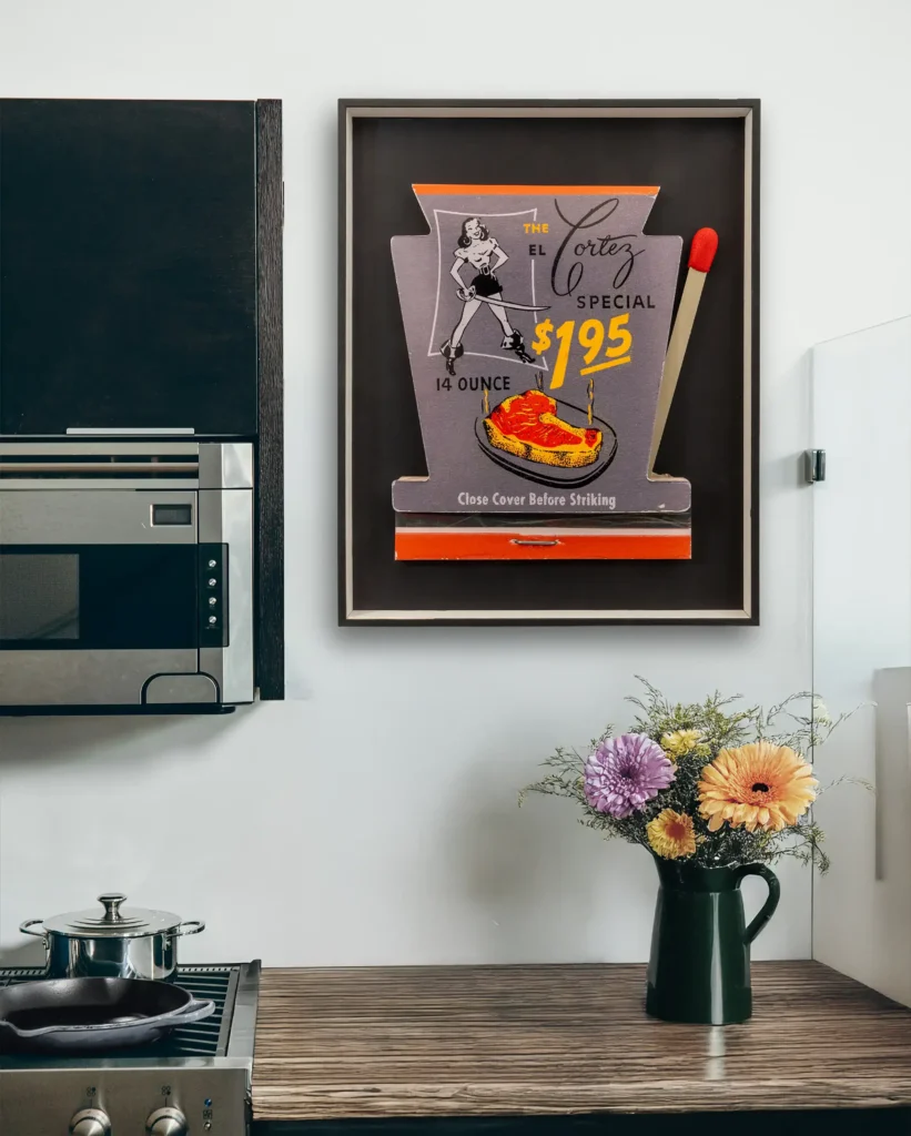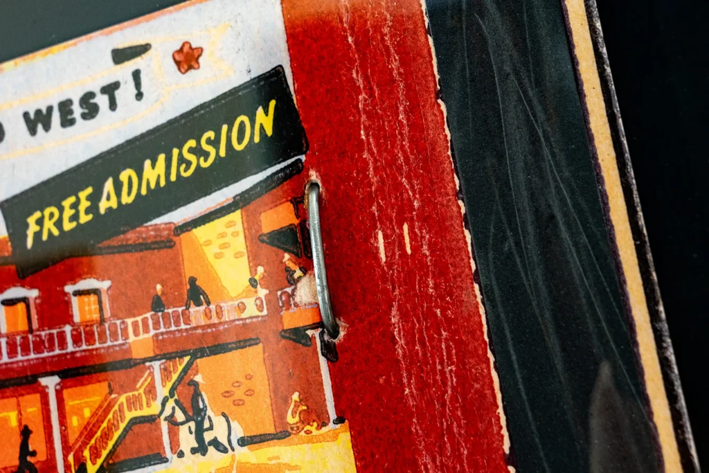 So, how is it made? I can’t deny that I enjoy blowing things up. By that, I mean enlarging, which was one of the processes involved in making pictures taken on film come to life before digital photography. I had several darkrooms and used them for years. The size of a matchbook cover is roughly equivalent to that of a film negative, and it’s not unusual to enlarge (or print) a negative onto photographic paper measuring 30 x 40 cm (approximately 12 x 18 inches), or even larger. The printed, enlarged matchbooks measure around 40 x 50 cm (15 x 19 inches), which is over ten times the original size. I use modern reproduction and scanning machines to capture every detail of the lovingly designed covers, including any imperfections. The prints are produced using a Hewlett-Packard eight-colour giclée machine. The prints are mounted on acid-free board and cut out by hand. They are then folded into the typical matchbook envelope. The sandpaper striking surface is added before the oversized metal clamp is put into the matchbook, because the clamp sometimes goes through it in the original design. The metal clamp is placed where the original staple would be on a real-world matchbook. This staple holds the row or rows of cardboard matches in place. It’s almost the same in my construction; without the clamp, it would fall apart. Before the large clamp is put into the large matchbook, the sandpaper striking surface is added, because in most cases the clamp goes through it in the original design. One, two or three matches stick out of one or both sides of the envelope. These long pieces of cardboard or wood have sculpted strike-anywhere heads (containing no harmful chemicals like sulfur or phosphorus!), which are covered in acrylic paint in the distinctive red (or sometimes brown or grey) that defines a factory-made match.
