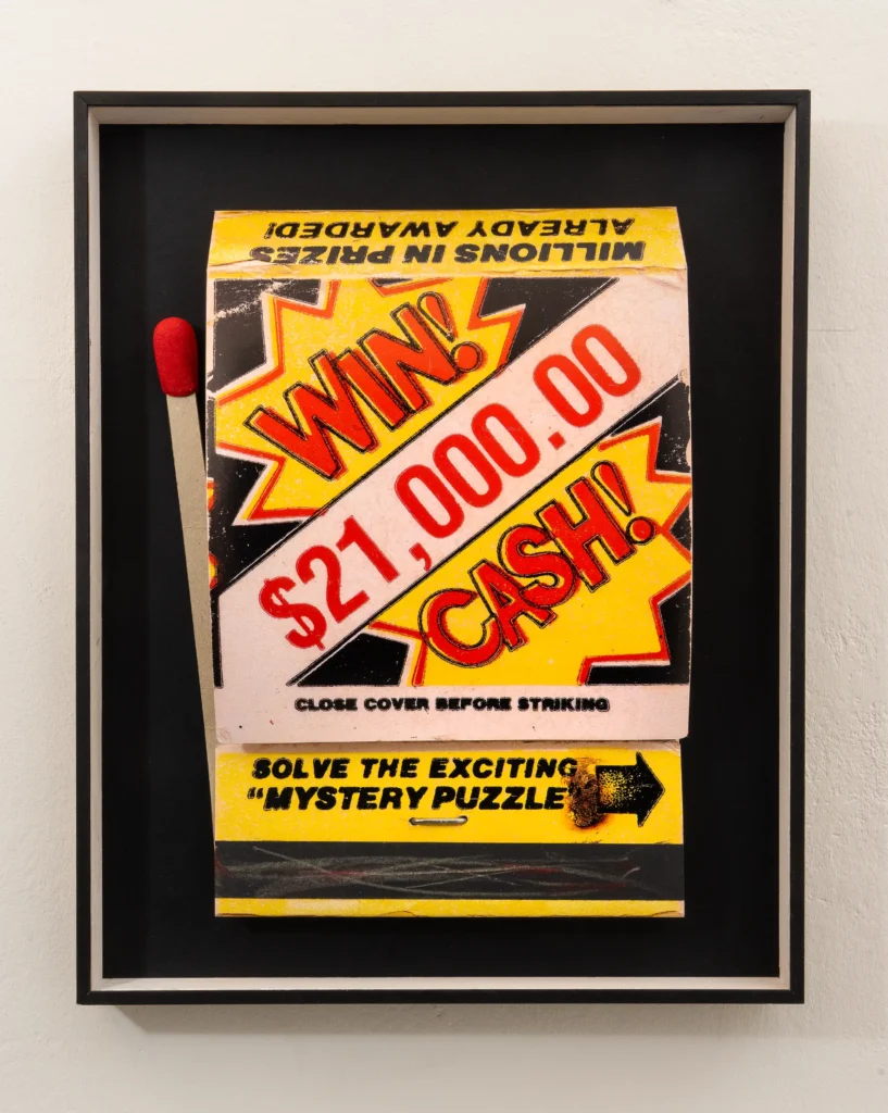 Raymond Hains, a founding member of Nouveau Réalisme, began exhibiting his “Saffa” and “Seita” works in Venice and Paris in the early 1960s. These were human-sized plywood enlargements of Italian and French matchbooks, complete with sandpaper striking surfaces rendered in abrasive paint. Hains pushed the concept further with billboard-scale reliefs, such as the “Saffa Super Matchbox” now housed at MoMA. His series continued into the 1970s, featuring monumental bronze “giant matches.” Through these works, Hains offered a witty critique of branding and monopoly culture, drawing attention to the power of everyday objects in shaping our perceptions.
