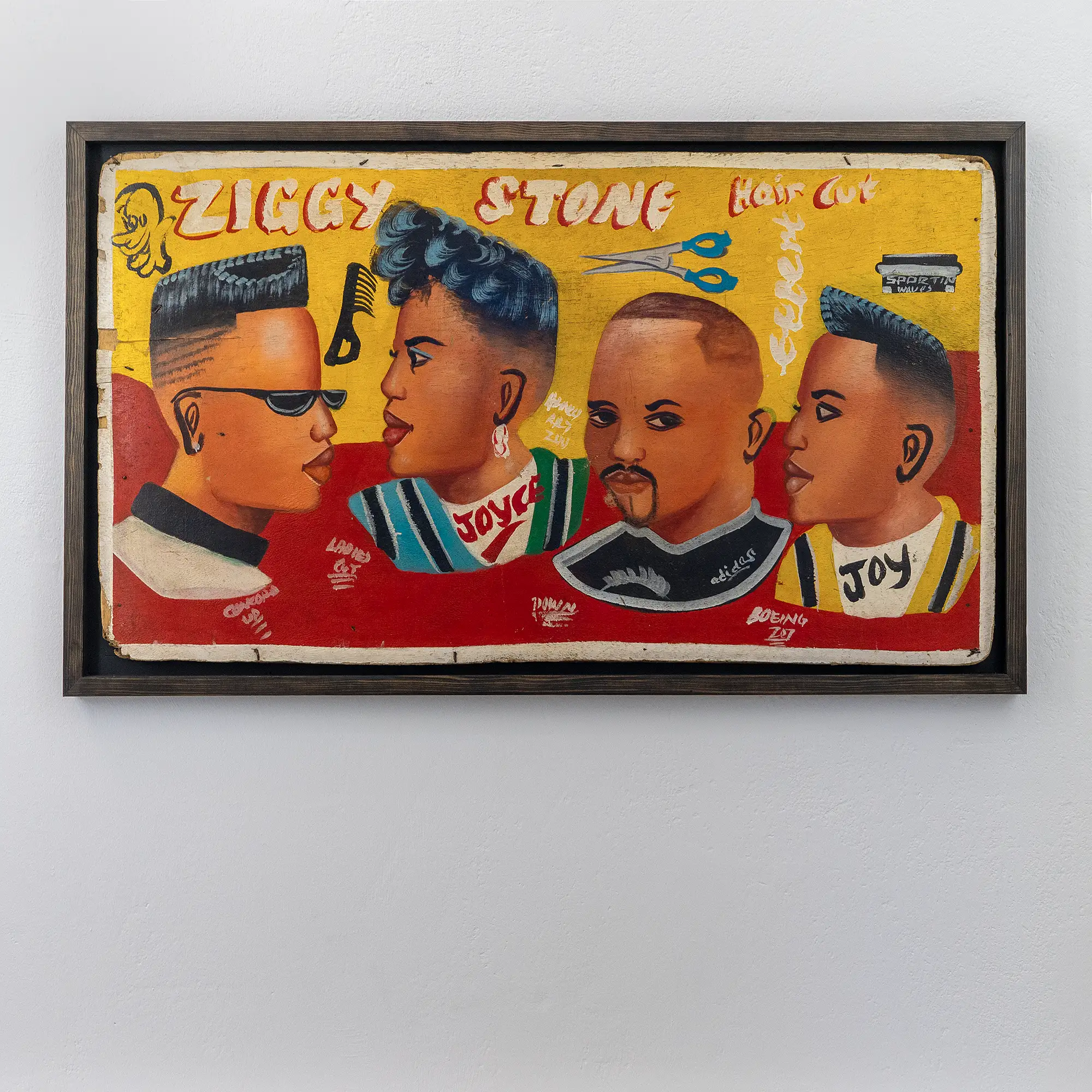 These painted hairdresser signs are handcrafted examples of folk art and cultural artefacts that embody the spirit of Ghanaian entrepreneurship, style and visual culture. Featuring bold colours, striking features and eye-catching designs on recycled materials, they tell stories through hairstyles inspired by local traditions and global trends. The signs are historical documents that preserve local traditions and demonstrate the creative use of art for advertising and expressing identity. Advertising signs in Ghana are part of a long-standing tradition of hand-painted shop signs and functional folk art found throughout West Africa.