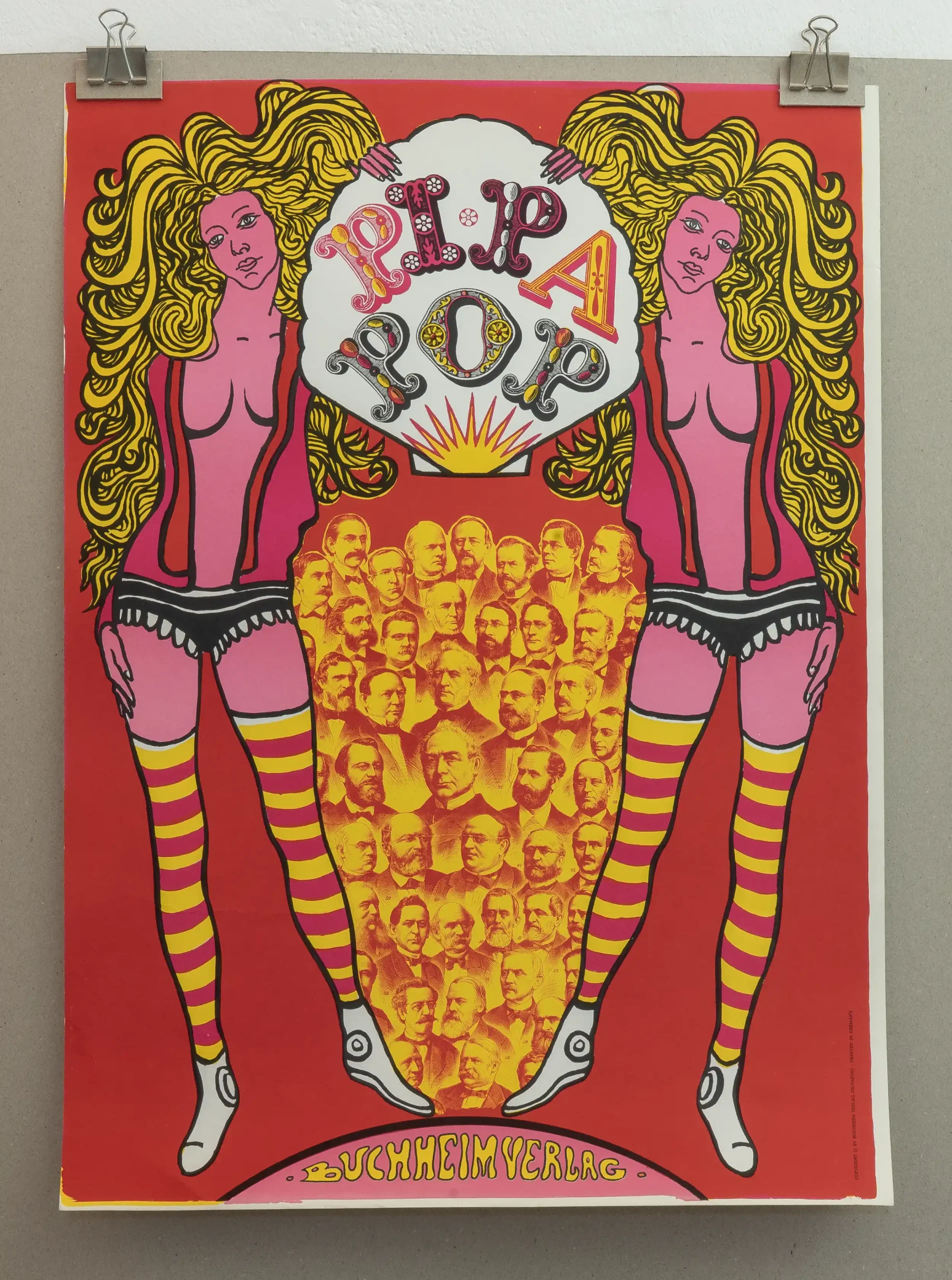 The Pi Pa Pop series originally included around 32 lithographed posters, with Buchheim later producing more for exhibitions and tours. He used transparent foils for his designs, and the prints were made using an iris printing technique, resulting in unique color blends for each piece. The posters were first exhibited in Munich in 1968 and later toured internationally, even reaching the United States. Print size is 24.4 x 17.6 inches (62 x 44.7 cm).