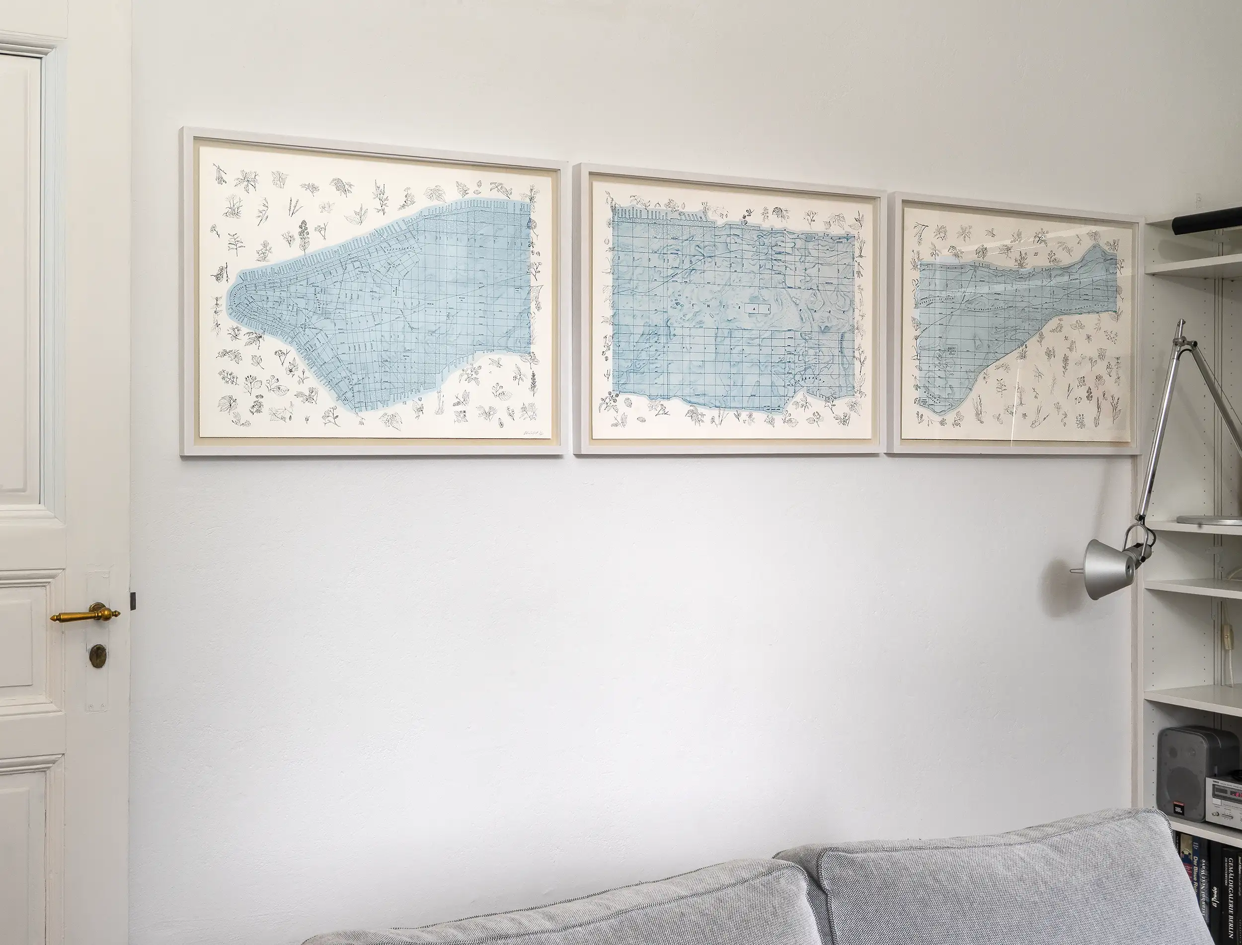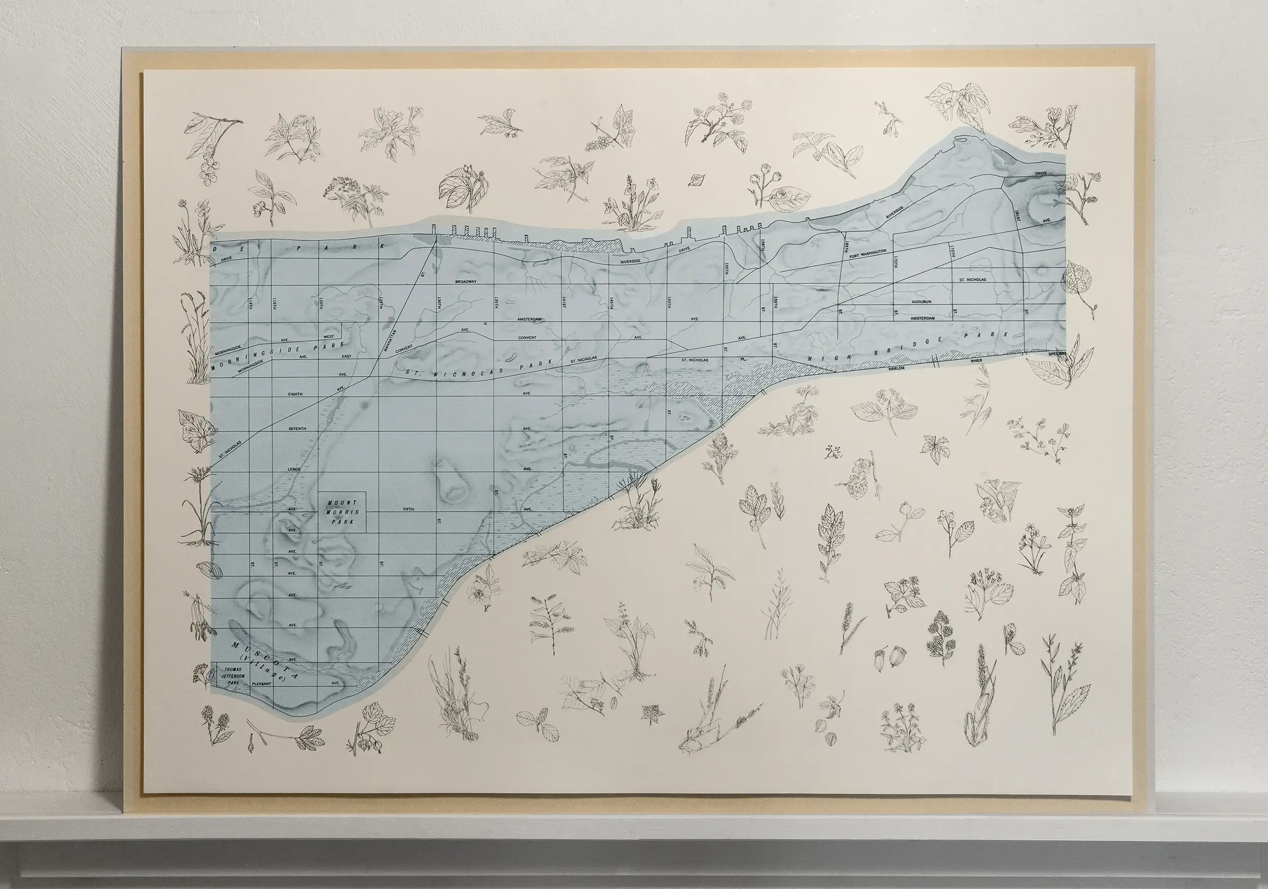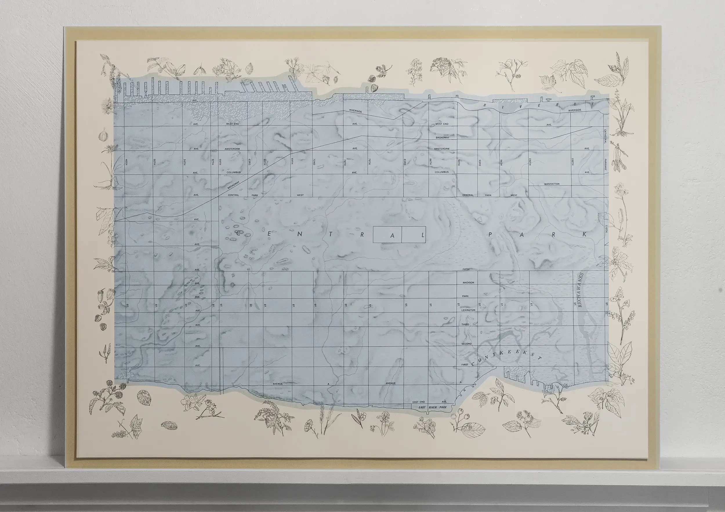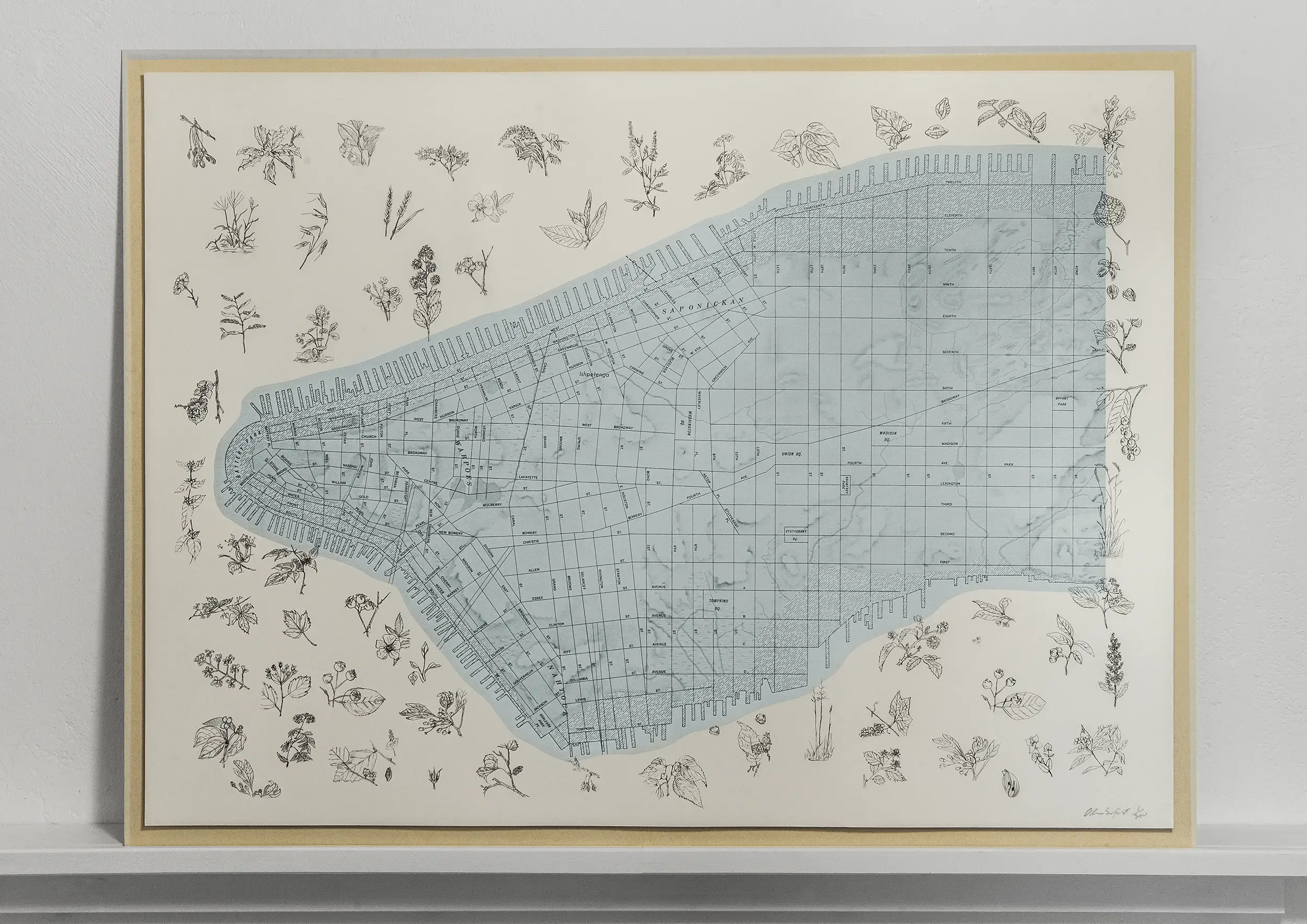 Manhattan Trytich is a set of lithographic prints by Alan Sonfist closely connected to Time Landscape. The set of three prints offers a panoramic bird’s-eye view of Manhattan. Along the waterfronts and on the white areas of the superb quality acid-free printing paper, Sonfist places intricate illustrations of indigenous plants, visually reconnecting the well-known Manhattan geography with its original flora. Rather than a conventional street map, the work focuses on Manhattan’s parks, with only a limited number of street names indicated – an invitation to the viewer to consider the interaction between urban life and the natural world that once existed in this location. Before becoming a city, Manhattan was a forested island inhabited by the Lenape people and called Mannahatta. The Lenape are an Indigenous people whose ancestral homeland includes present-day New York, New Jersey, and parts of Pennsylvania and Delaware. They are a Native American or American Indian nation of the United States.