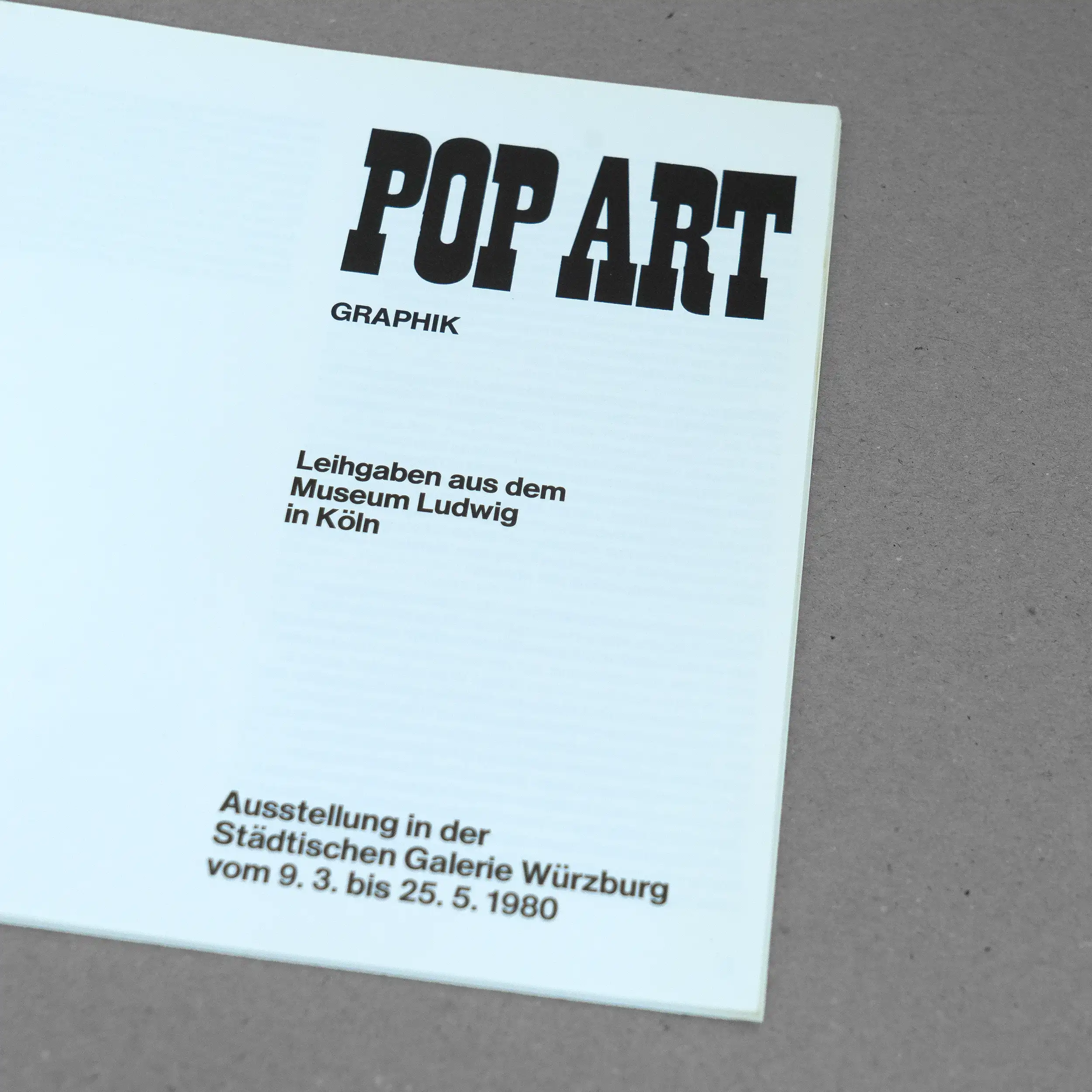 Pop Art Grafik is a small, stapled catalogue measuring 7.9 x 8.3 inches (20 x 21 cm) and containing 40 pages. It was produced for an exhibition of Pop Art masterpieces from the Sammlung Ludwig (Collection) in Würzburg, Germany, in 1980 and is in very good condition.