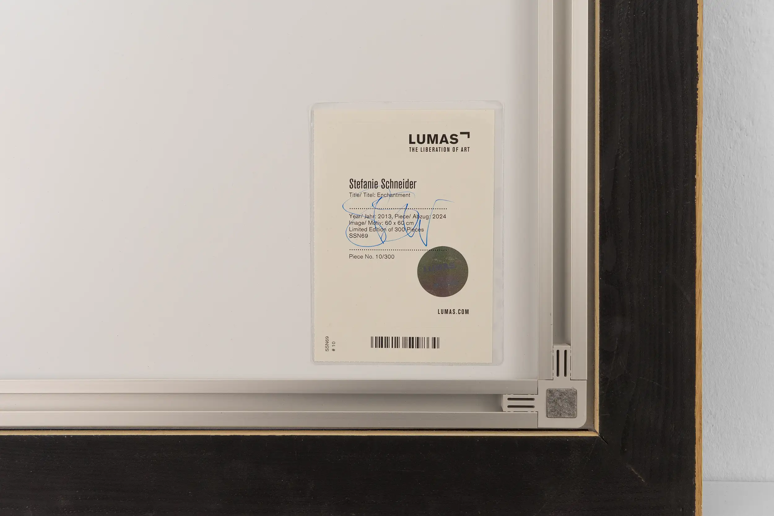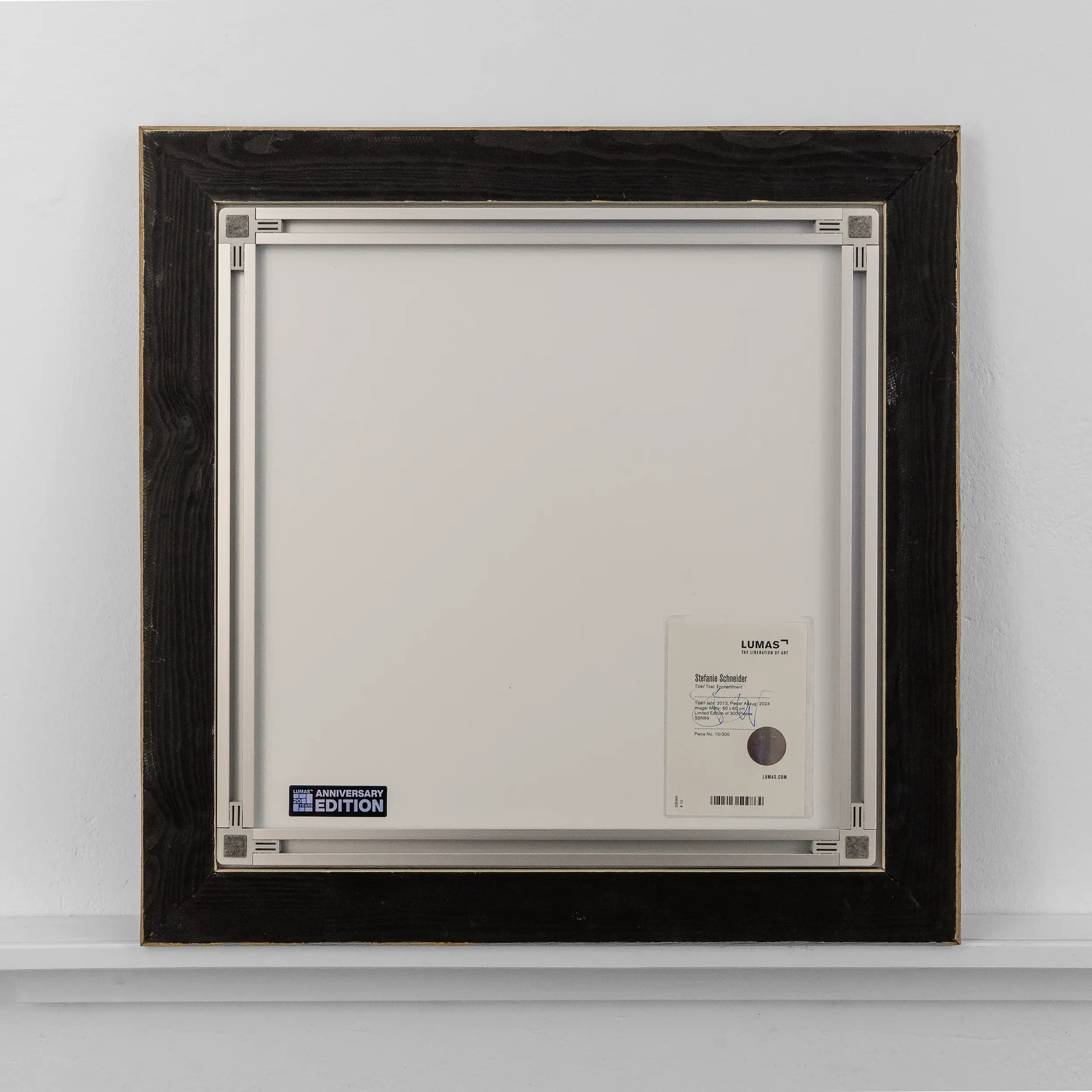 The colour print is 23.5 x 23.5 inches (60 x 60 cm) in size and is mounted behind matt plexiglass. This edition is limited to 300 pieces; we have piece number 10/300. Each print is numbered and signed, and has a Lumas certificate of authenticity attached. A shadowbox frame has been added by us. It is from beech wood (and pine for the back) and is not a Lumas product and mounted with Velcro tape.