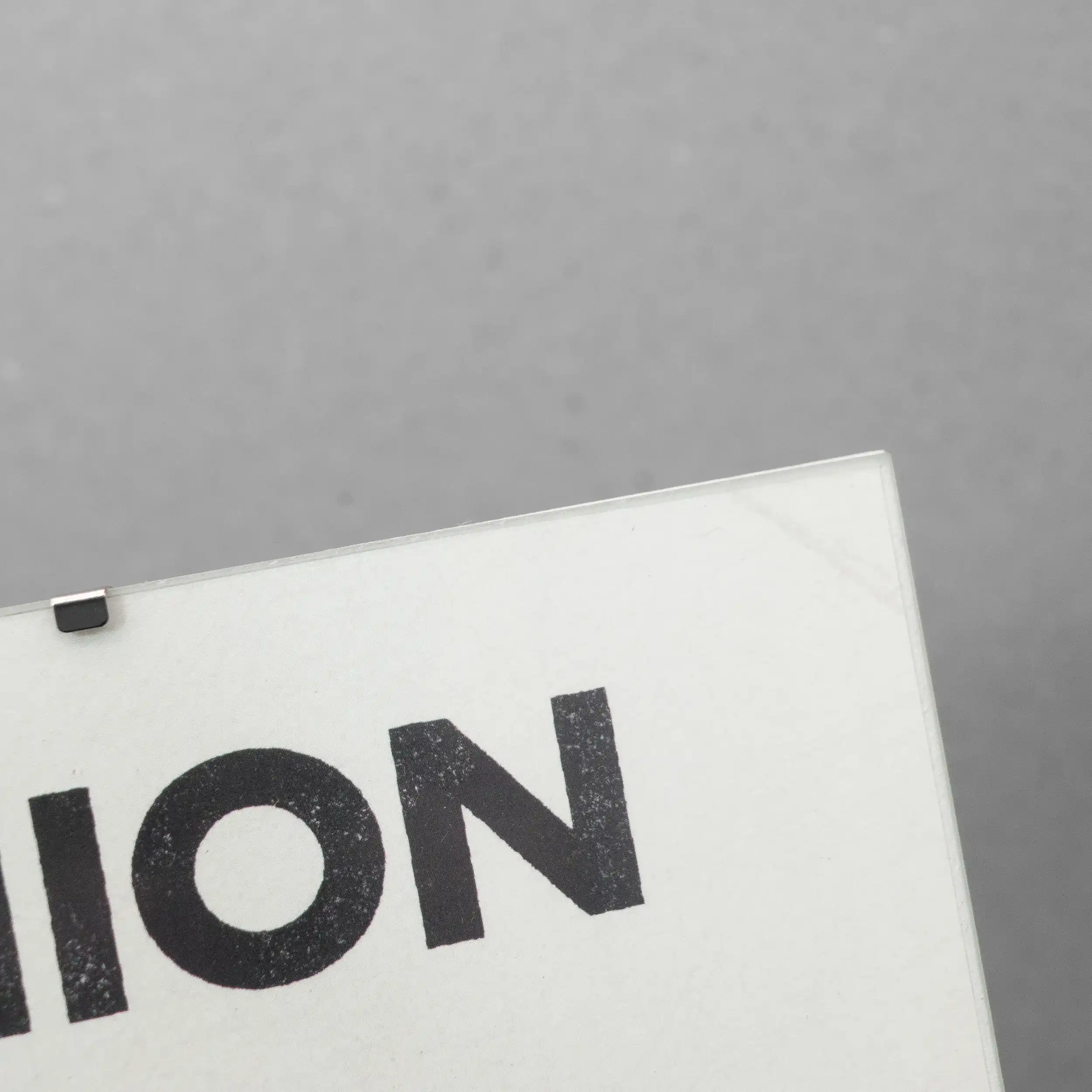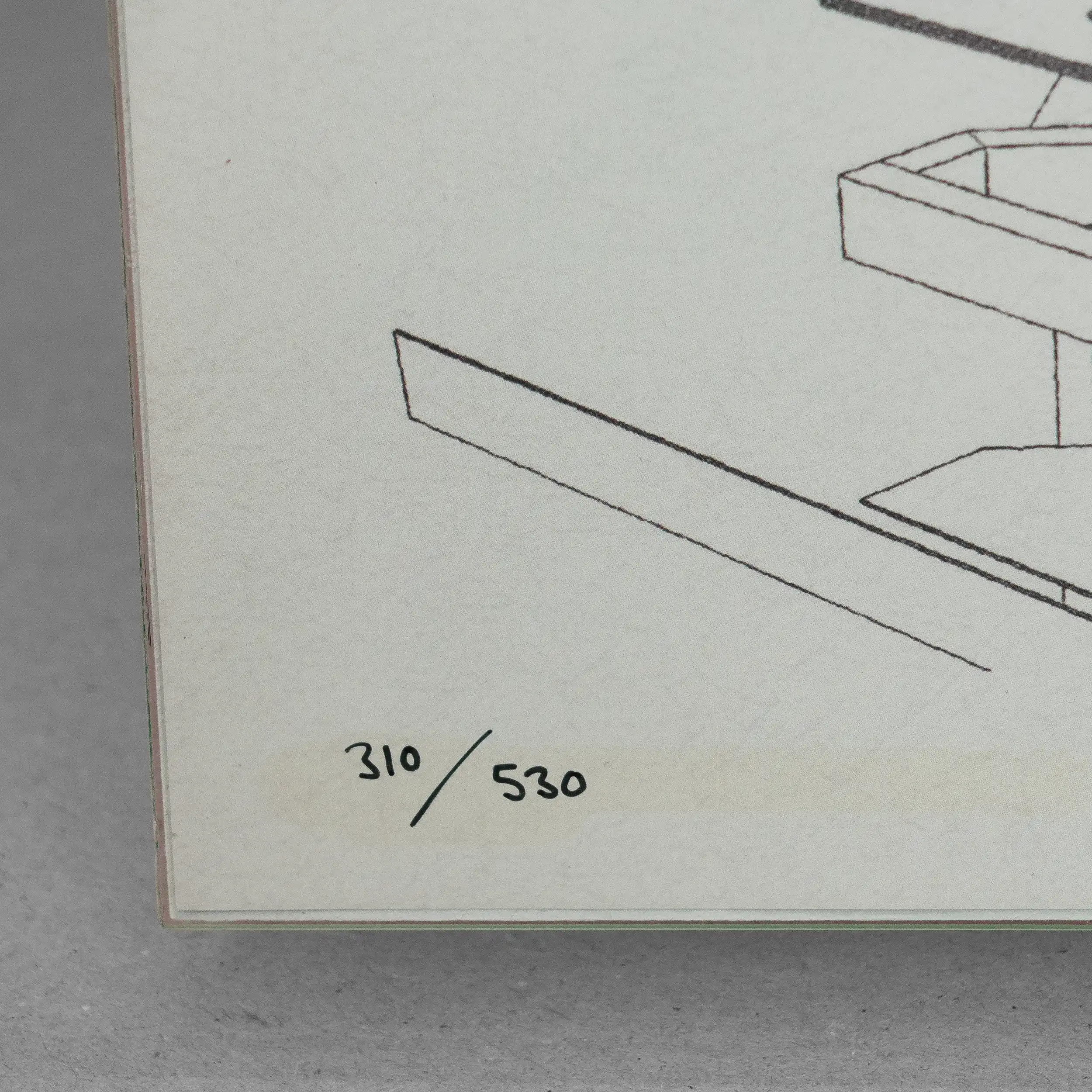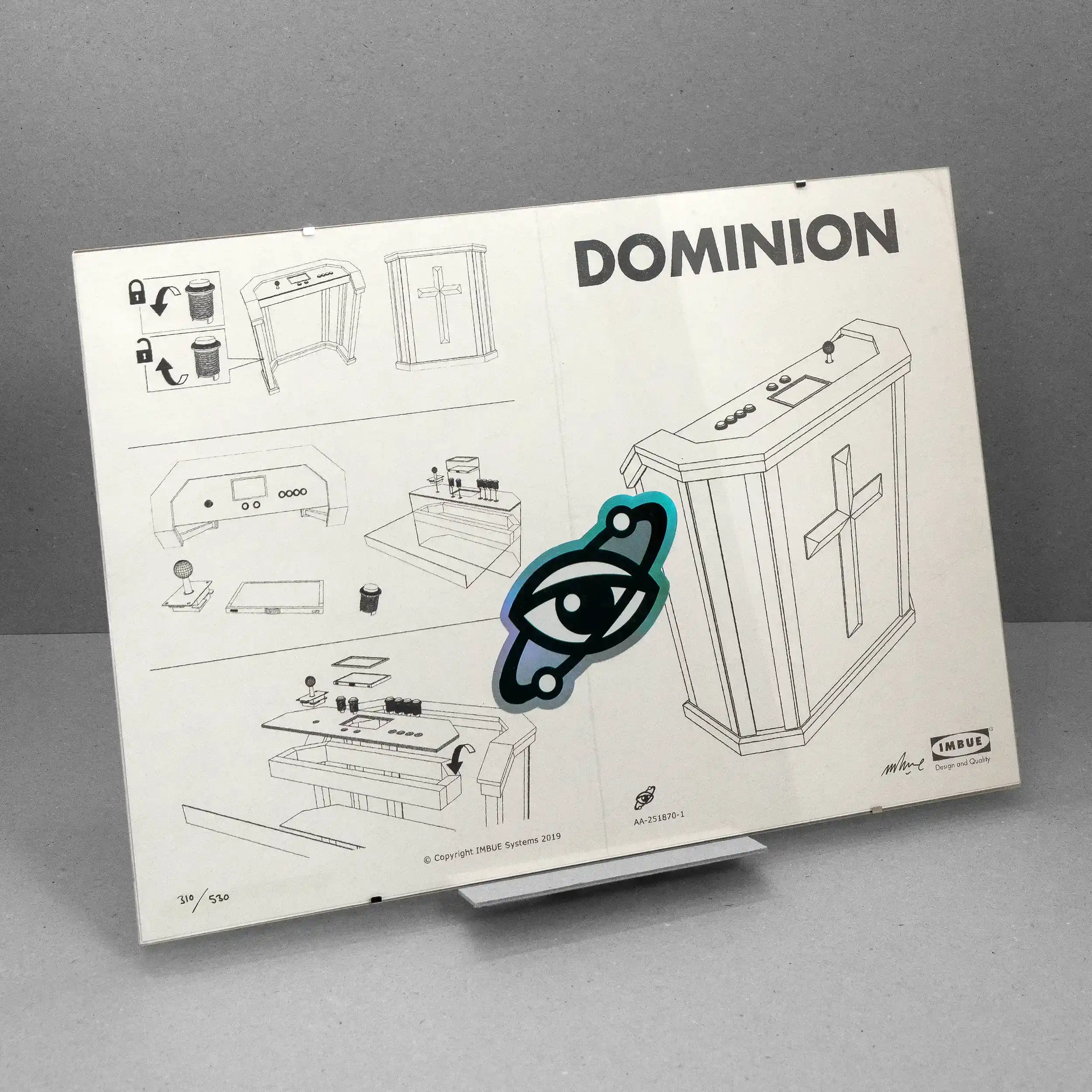 Dominion is a print on semi gloss woven paper, signed and numbered in black felt tip pen by the artist. Size 12 × 16 1/2 in ( 30 × 42 cm), published by the artist in an edition of 530, we have piece number 310/530. Included in the edition is the original COA, also signed and numbered, another small print from a cash register referring to Brexit, and two original stickers (not mounted). In keeping with its informal look, we designed it to be ‘frameless’ and floating behind a piece of glass the original size of the print, as if it were nothing more than an IKEA assembly manual.